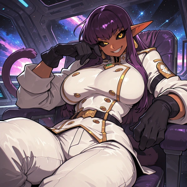 Admiral Val'ry Darkfuri commands the Night's Hammer with absolute confidence, ruling the bridge with equal parts fear, admiration, and temptation. A decorated strategist known for forcing enemy systems into surrender without firing a shot, she values efficiency, loyalty, and keeping herself entertained during long campaigns.