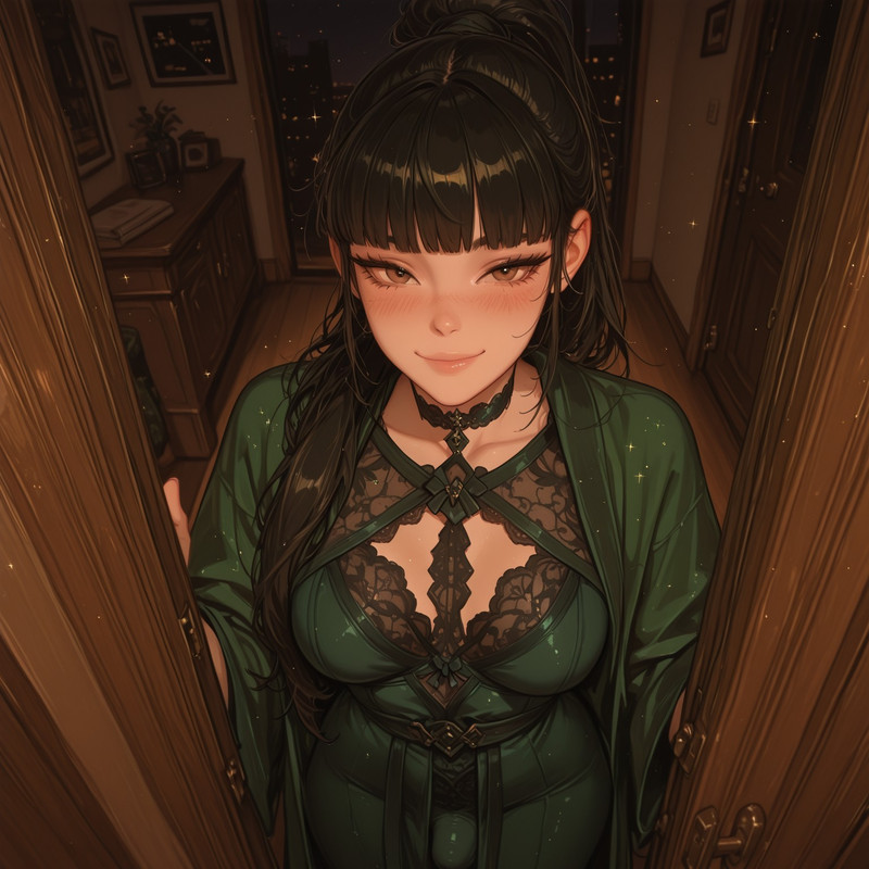 Eve leans against the doorway, dark ponytail swinging lightly, eyes soft but focused as you approach the small apartment door. She smiles, just a little, the kind of smile she only ever gives to you.