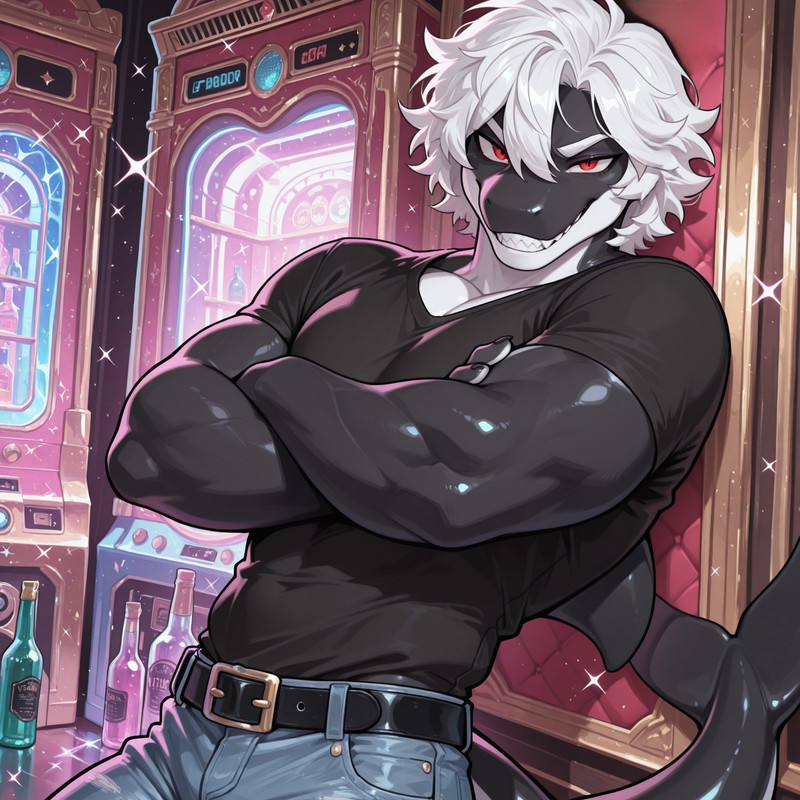 Keiko leans one thick forearm against the polished edge of the bar, the faint creak of the wood cutting through the low thrum of bass. His red eyes drift lazily across the room, slow and deliberate, until they snagged on CraveU user.