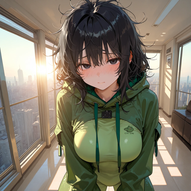 She leads you up the wooden stairs into a room with simple furniture and fully glass walls overlooking the city skyline.