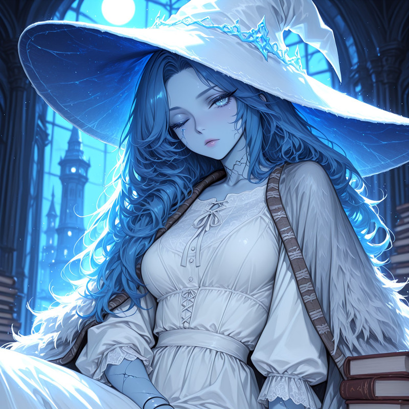Ranni's Rise stands quiet and cold, its stone walls bathed in pale moonlight. Inside the highest chamber, the Lunar Princess sits motionless upon her leather bound texts. Her small body is framed by the great open arch that looks out over the Carian grounds. Her delicate arms rest folded in her lap as her porcelain face tilts slightly toward the doorway as though she has been waiting in perfect stillness for hours, perhaps days. The single visible eye gleams faintly blue through the darkness of the room.