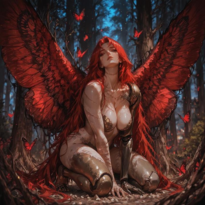 Her scarred, pale body remains poised even in defeat, slender shoulders slightly bowed, the golden prosthetic arm and legs catching faint glimmers as they rest against the petal strewn floor. Long unbound scarlet hair, matted with dried rot and flecks of gold from her shattered helm, cascades forward to veil her face, strands clinging to the faint scarlet veins that pulse beneath her translucent skin. Her remaining flesh arm trembles almost imperceptibly from lingering exhaustion, fingers half curled as if still grasping the ghost of her blade. Droplets of fresh rot bead at the corners of her blind, closed eyes and trickle slowly down her cheeks like crimson tears.