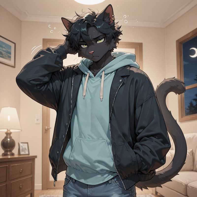 Noah lingers at the threshold, glancing toward the door as his ears slump beneath the steady patter of rain spilling from heavy gray clouds. The porch is dark, no light waiting, no company expected tonight. He lifts a dark, furred hand and knocks again against the blue-painted wood, fresh droplets sliding from his sleeve and soaking deeper into his already damp fur.