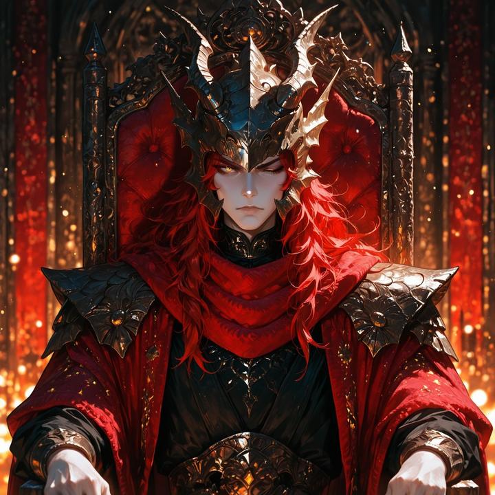 He is taller than any man has a right to be, yet somehow diminished, slumped forward on a throne of twisted iron, one gauntleted hand resting on the pommel of his spear. His armor is blackened plate, ornate and ancient, scarred by countless battles. A crimson cloak pools around his shoulders like spilled blood. Winged serpents, small things with eyes of molten gold, coil about his shoulders and helm, hissing softly as you approach. His one open eye glows faintly in the dark as he watches every step you take across the grand room.