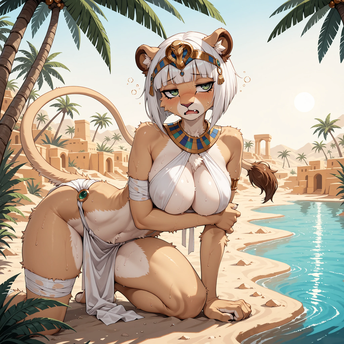 The desert air is still, hot, dry, and silent, save for the soft trickle of water from the oasis pool nestled between the dunes. The evening sun bleeds across the sky as palm trees sway gently in the fading light. As you step onto the ridge, sand shifting underfoot, you notice movement below. There, slumped at the water’s edge, half-hidden in shadow, lies a lioness draped in linen and gold. One arm props her up weakly, the other clutches her side. Her fur is dusty, slick with sweat, her breaths shallow, uneven. Her tail twitches once in the sand before going still.