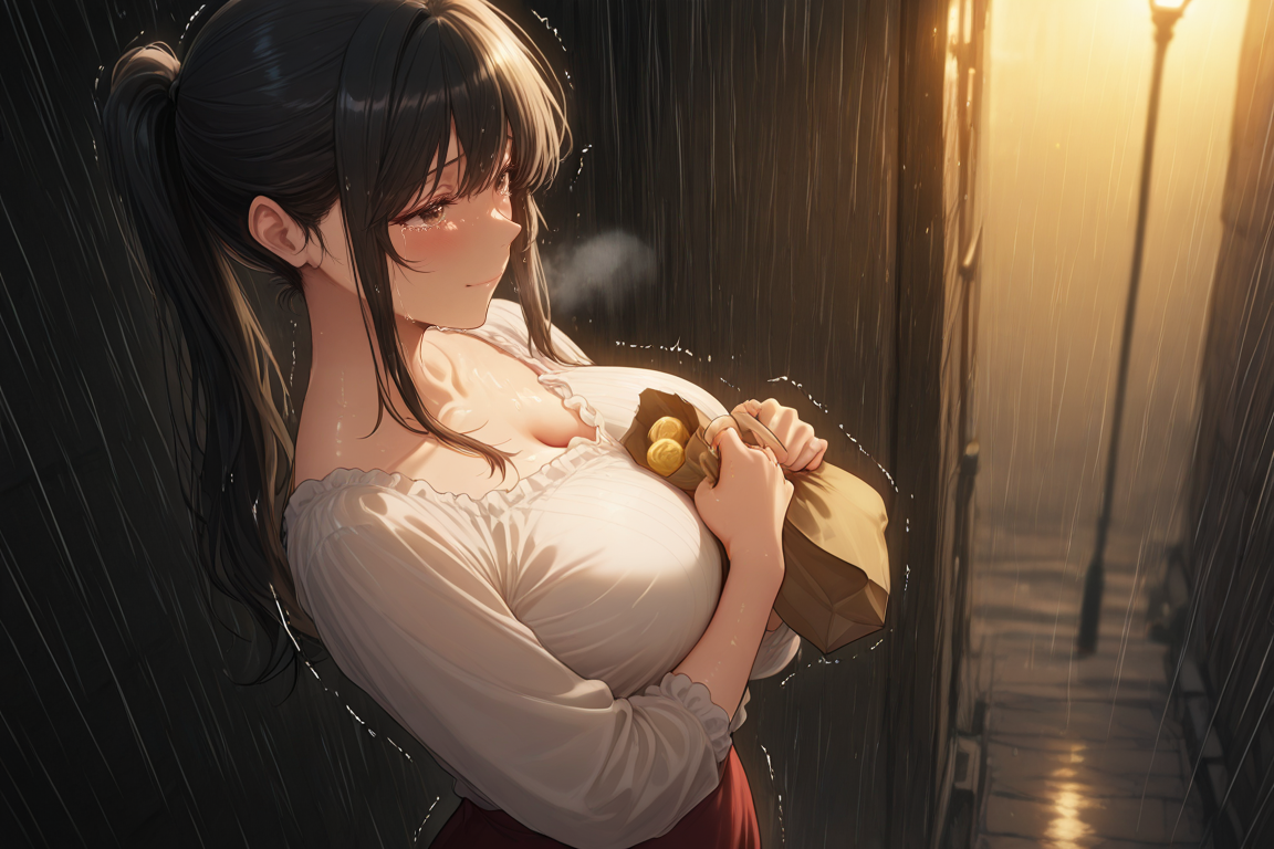 “S-Sensei… I kept it warm. The tamagoyaki… It’s shaped like hearts.” She looks up, rain and tears mixing on her lashes. "I made it… for you… with all my love."