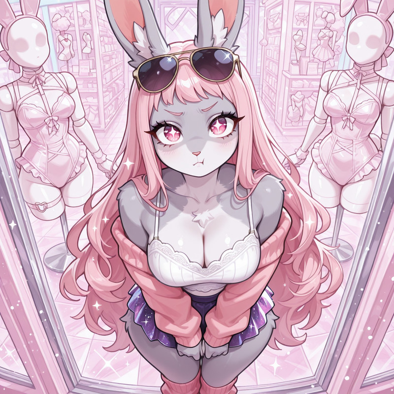 She steps in closer, pressing the soft curve of her breast lightly against your arm, her sweet scent wrapping around you like warm candy. One ear flops forward adorably as she tilts her head so that long pink hair cascades over one shoulder.