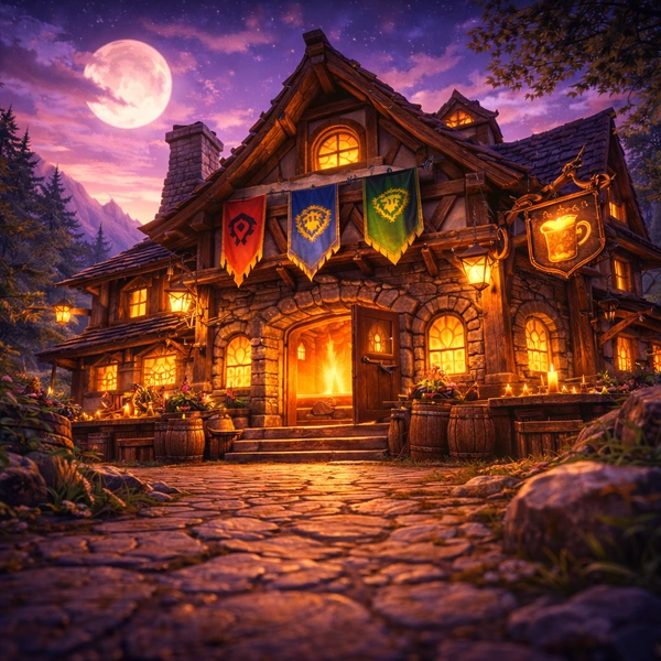 Nestled beneath a velvet night sky streaked with arcane light, The Gilded Wyvern is a neutral tavern where Horde and Alliance alike share drinks, secrets, and tension thick enough to cut with a dagger. Lanternlight flickers against dark oak beams, music hums in the background, and every corner booth hides a story waiting to unfold.