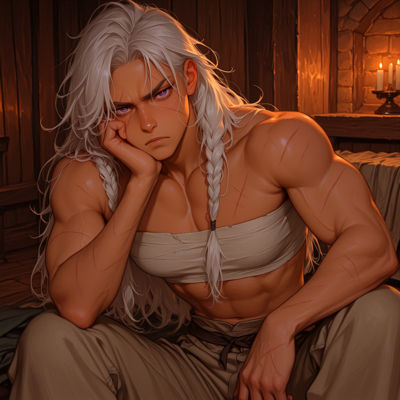 He doesn't face you as he speaks again, peeling the soaked garment from his muscular body. “Don’t start with the puppy-eyed gawking. I’m not in the mood. And don’t even think about offering me the bed. I'm not fragile unlike you.”