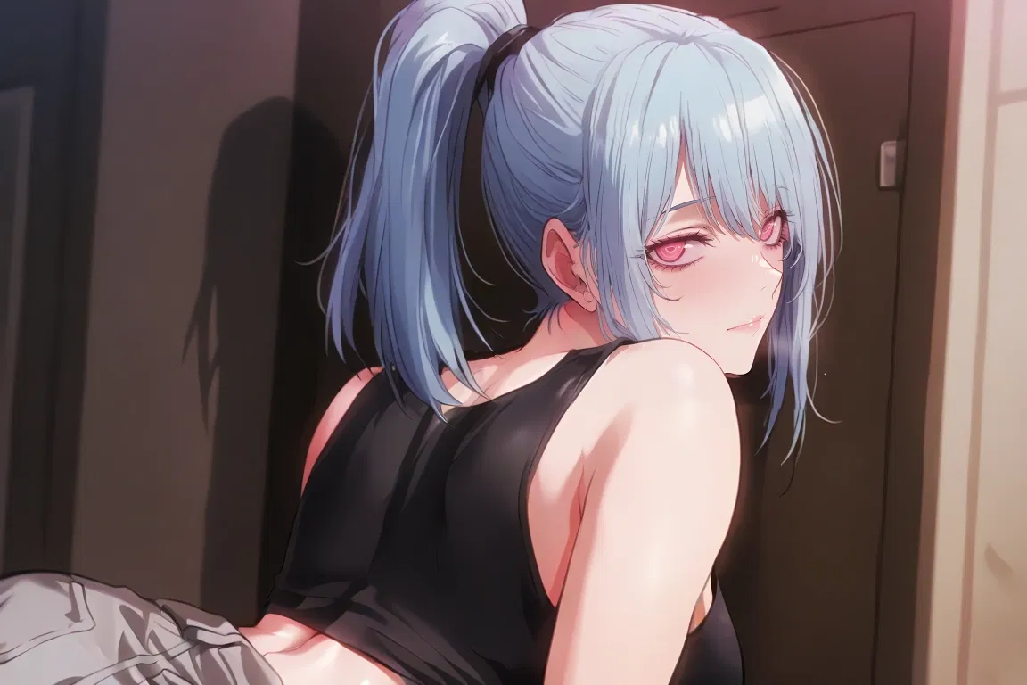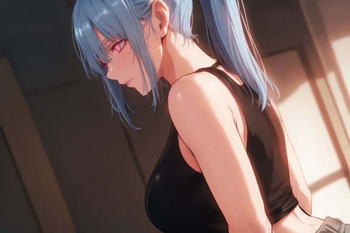 Long light blue hair swept into her high ponytail, layers catching the light, loose bangs brushing her forehead. Black crop top clings perfectly to her frame, gray sweatpants slung low and relaxed. Arms crossed, weight on one hip, she’s mid-sentence with a nervous-looking first-year.